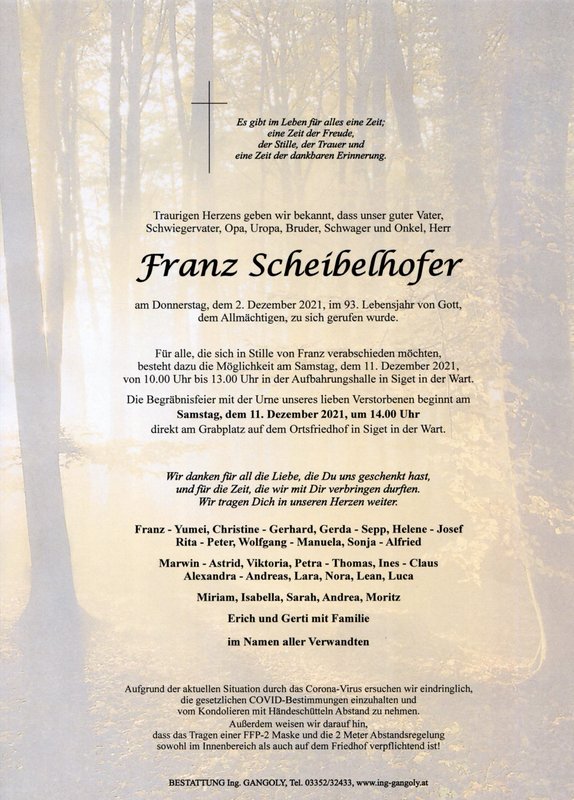 Urnenbegräbnis am Samstag, 11. 12. 2021, um 14.00 Uhr
