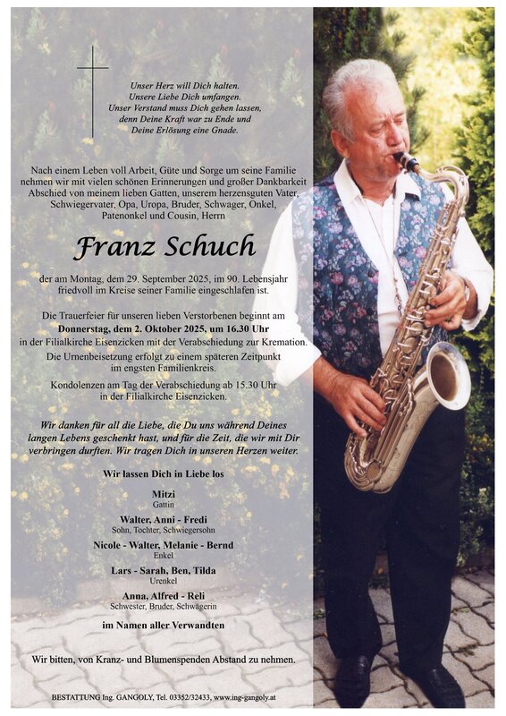 Die Urnenbeisetzung erfolgt zu einem späteren Zeitpunkt im engsten Familienkreis.